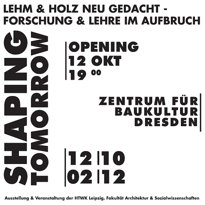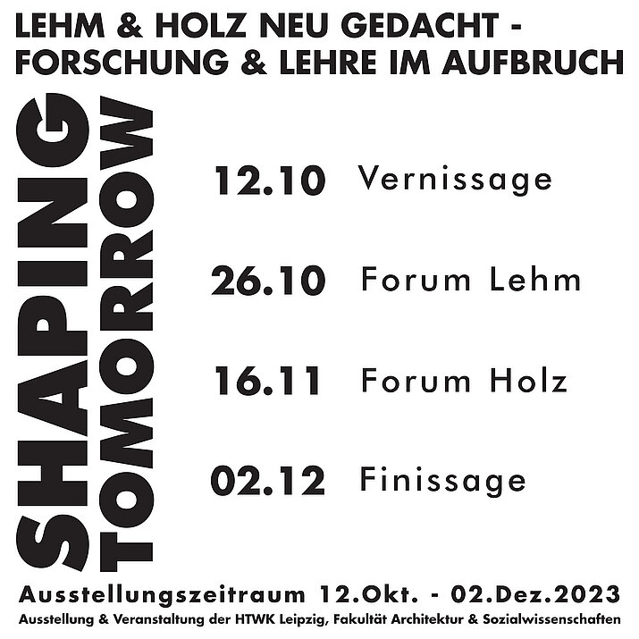 Die Ausstellung "SHAPING TOMORROW - Lehm und Holz neu gedacht. Forschung und Lehre im Aufbruch" bietet Einblicke in Lehr- und Forschungsaktivitäten in den Architekturstudiengängen an der HTWK Leipzig. Präsentiert werden Pavillonentwürfe von Masterstudierenden für das Sächsische Staatsweingut Schloss Wackerbarth. In dem Seminar war der Fokus grundlegend auf den Einsatz der Baustoffe Lehm und Holz als umweltfreundliche Alternative zu herkömmlichen Materialien gerichtet. In einem inhaltlich eng angebundenen Seminar mit konzeptionell wissenschaftlicher Ausrichtung und mit technischer Unterstützung der Forschungsgruppe FLEX entwickelten die Studierenden parallel zu den Pavillon-Entwürfen digitale Konzepte für Stampflehmanwendungen in nicht orthogonal-ebenen Schalungen. In einem dritten Bereich werden in der Ausstellung anhand von Modellen, Plänen und Animationen Projekte der Forschungsgruppe FLEX an der Schnittstelle von digitaler Planung und Fertigung – vornehmlich in Holz – vorgestellt.