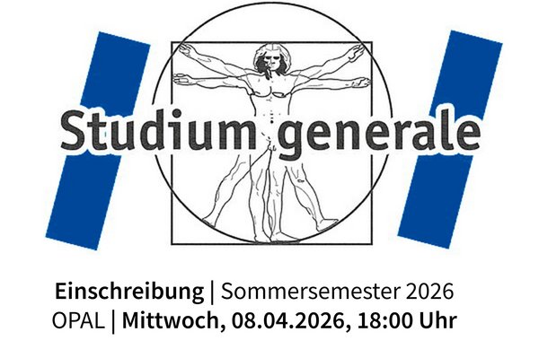from 01. April 2026 Einschreibung ins Studium generale ab 8. April Das Programm für das Studium generale im Sommersemester 2026 ist online – Einschreibung in die Kurse erfolgt am 08.04.2026 ab 18:00 Uhr more information