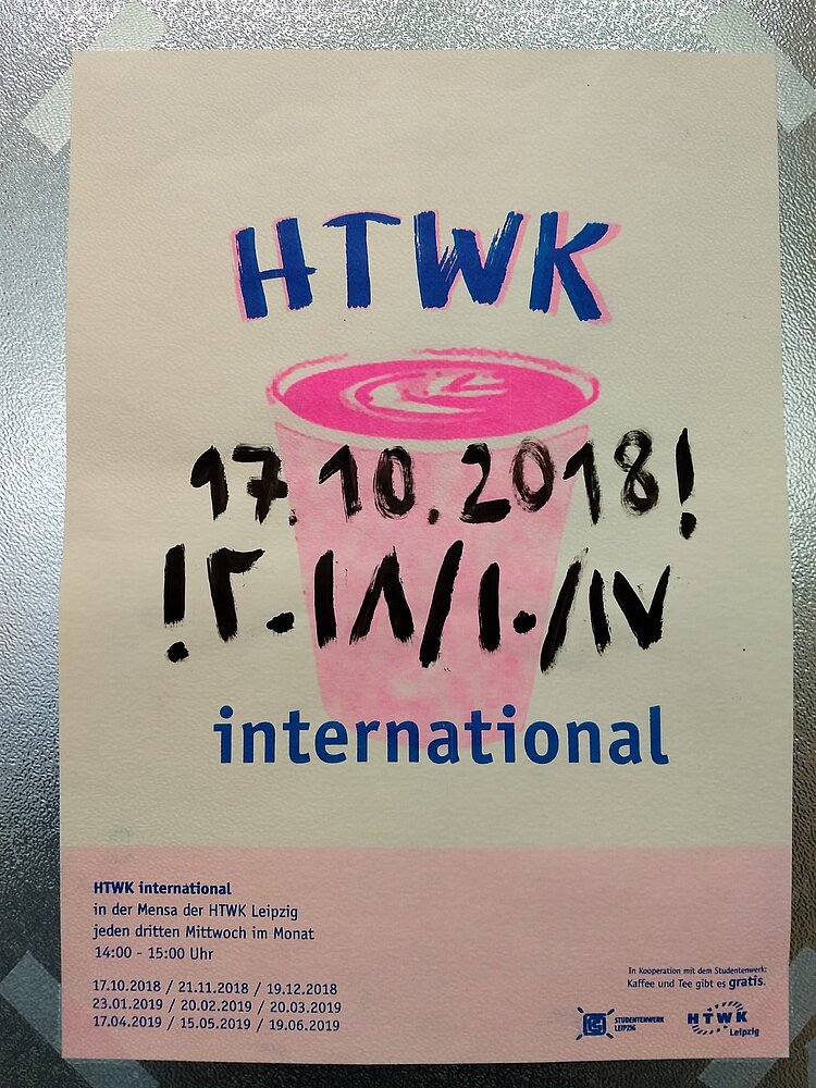 Ab dem 17.10. finden regelmäßige, offene Treffen in der Mensa der HTWK Leipzig statt. Alle Studierende haben in dieser Stunde die Möglichkeit, gemeinsam einen Kaffee oder Tee zu trinken und sich auszutauschen.