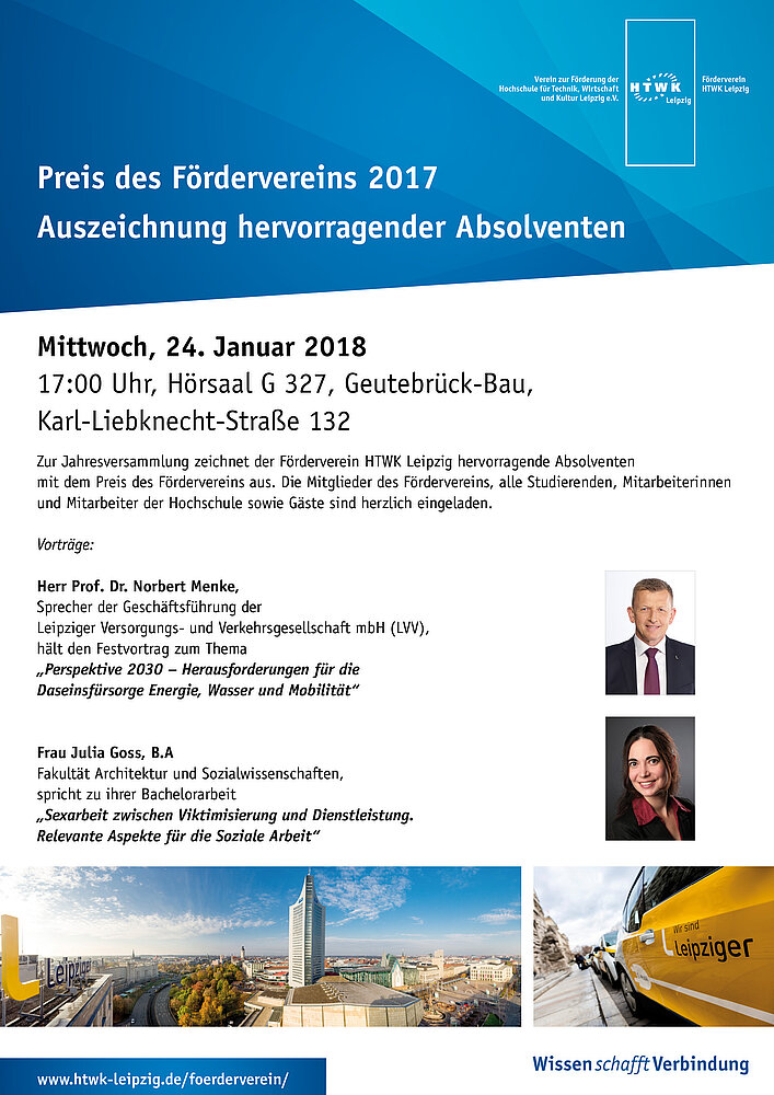 Auf seiner Jahresversammlung zeichnet der <link standard-link>Förderverein HTWK Leipzig alljährlich hervorragende Absolventinnen und Absolventen mit einem Preis aus. Die Mitglieder des Fördervereins, alle Studierenden, Mitarbeiterinnen und Mitarbeiter der Hochschule sowie Gäste sind herzlich eingeladen.